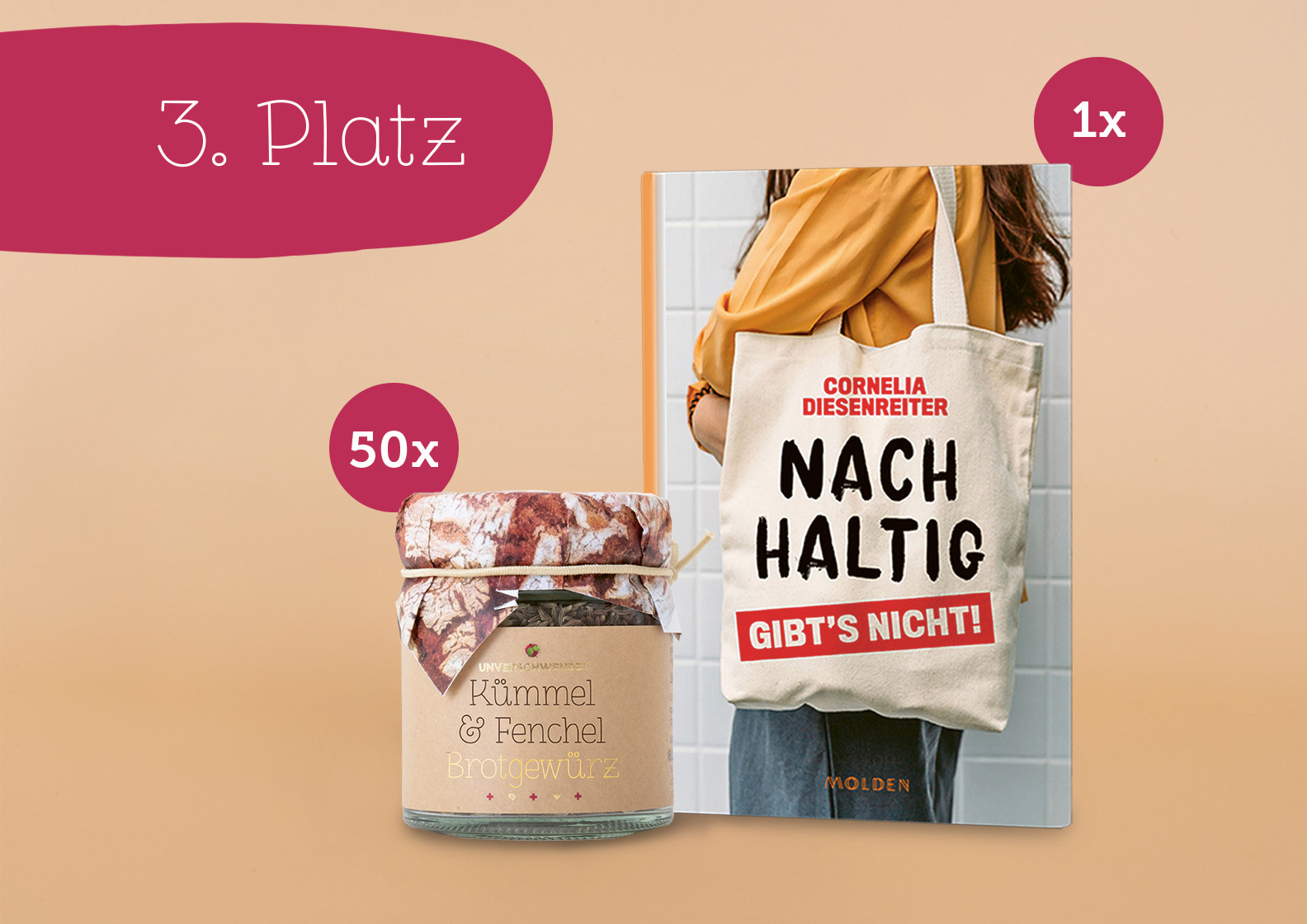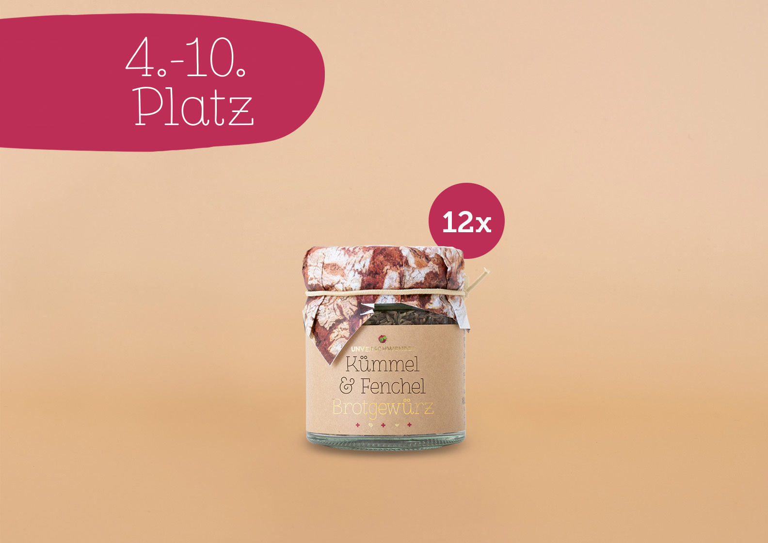 Teilnahmeform: Während dem 17.9. und 16.10.2024 wird das Bio Kümmel & Fenchel Brotgewürz + Gewinnspielflyer mit Rezept bei jeder Unverschwendet Webshop Bestellung automatisch und kostenlos beigefügt.